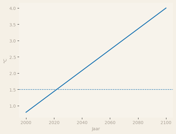 Op de grafiek zie je een stijgende lijn die de opwarming van de aarde weergeeft. Op dit moment begeven wij onszelf in gevaarlijk gebied. Ondanks het klimaatakkoord, is het niet gelukt om onder de maximale opwarming van 1,5°C te blijven. Als we op deze manier doorgaan met onze uitstoot, zal de aarde steeds verder opwarmen. Een paar graden verschil lijkt misschien klein, maar het heeft catastrofale gevolgen voor het leven op aarde. De opwarming gaat niet over een warme dag, maar over een stijging van de gemiddelde temperatuur van de hele planeet. Elke 0,1°C telt!